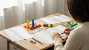 苦手意識が出るときは、問題をさらに小さく分けて取り組みましょう。色分けやカードを使って視覚的に支援すると理解が進みやすくなります。例えば分解して考える練習や、同じ問題を繰り返す短時間の練習を取り入れてください。